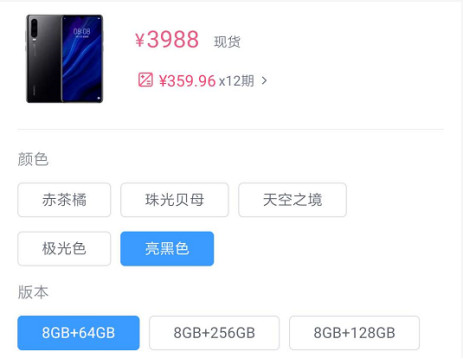 商评君注意到,分期乐自营华为P30(亮黑色)8GB+64GB版本售价3988元,分12期付款的还款计划是359.96×12期。