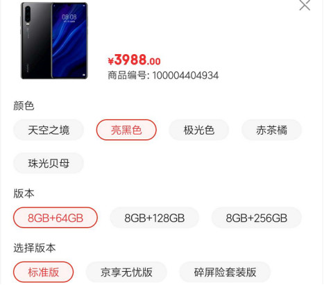 京东自营华为P30(亮黑色)8GB+64GB版本的售价也是3988元。