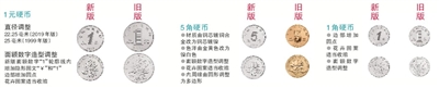 硬币方面,2019年版第五套人民币1元、5角、1角硬币调整了正面面额数字的造型,面额数字字体由衬线体调整为无衬线体并稍作倾斜处理。