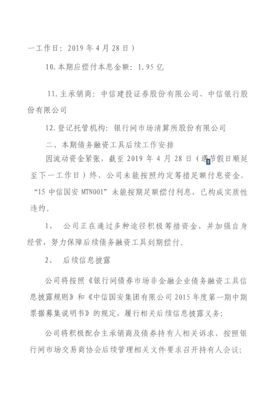 新浪财经讯 4月28日消息,中信国安公告称,未能按期足额偿付“15中信国安MTN001”利息,已构成实质性违约。