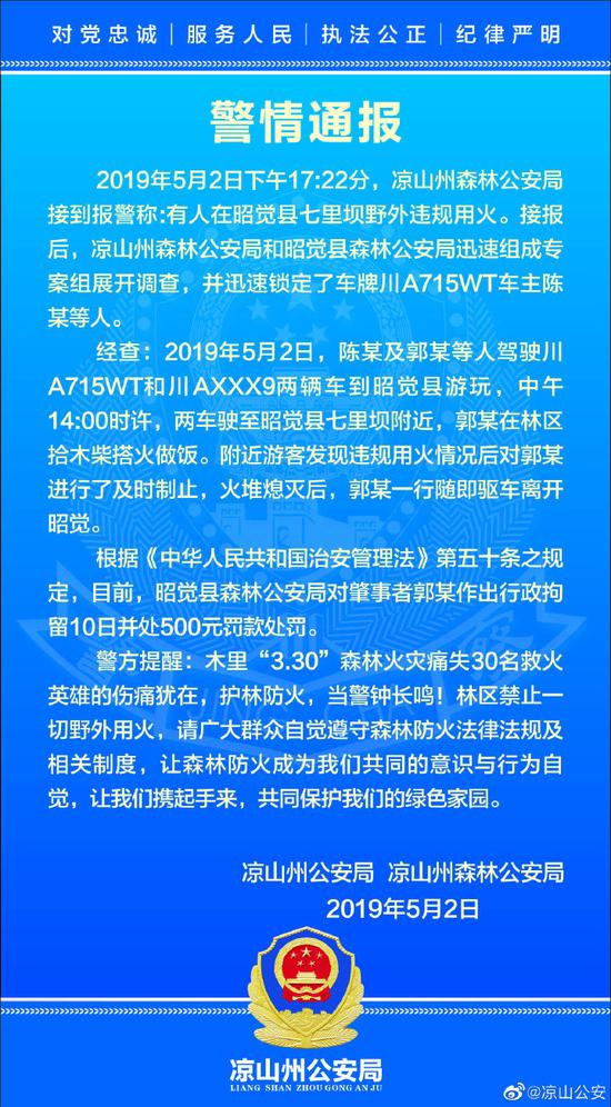 原标题:四川游客在林区生火做饭被行拘,凉山警方:伤痛犹在警钟长鸣