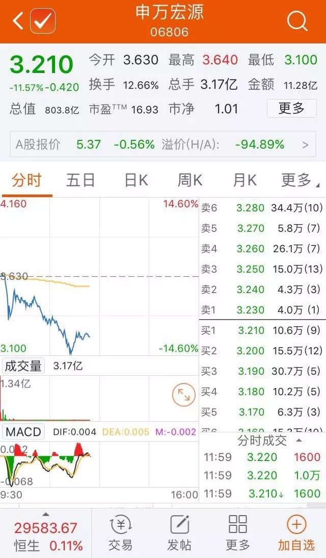 4月26日,申万宏源在港上市,开盘后破发,一路下跌。截至中午收盘,申万宏源H股报3.21港元,跌0.42港元,跌幅11.57%。