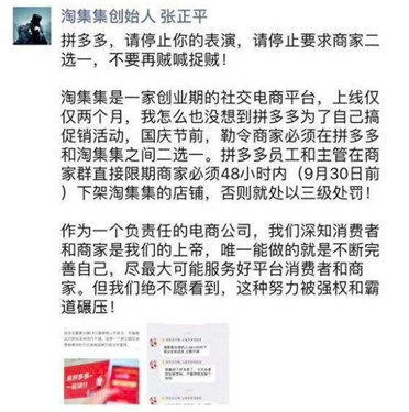 值得注意的是,拼多多在指责别的平台强制商家二选一的同时,自己也被控诉。据淘集集创始人张正平发布的朋友圈内容显示,2018国庆节前,拼多多勒令商家在拼多多和淘集集之间二选一,限期商家必须48小时内下架淘集集店铺,否则就施以最严厉的三级处罚。