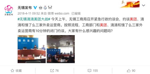 据媒体报道称,在滴滴外卖刚入驻无锡时,美团饿了么对商户做出了强制性的“规定”,不准入驻滴滴外卖。一开始,商家们并没有当回事,认为这只是美团和饿了么表面上的“警告”。谁知,在入驻滴滴之后,商家发现自己的店铺在美团饿了么上被下架。对此,无锡工商局紧急约谈了三家外卖企业,要求他们停止强迫商户二选一的不正当竞争行为,同时不得以高补贴的外卖大战扰乱无锡外卖市场。