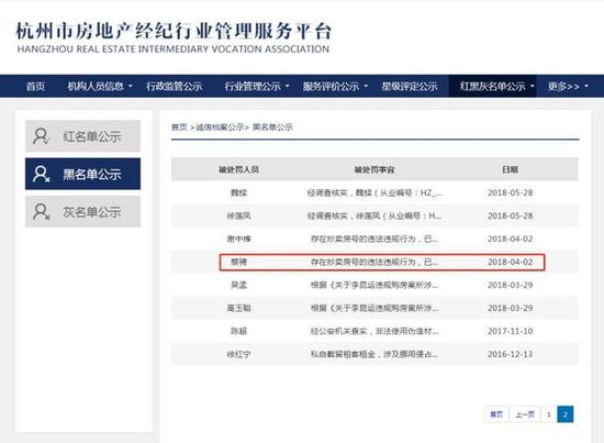 在杭州市房地产经纪行业管理服务平台上公布的“黑名单”经纪人一共18人,属于“禁止其从事房地产经纪行业”。