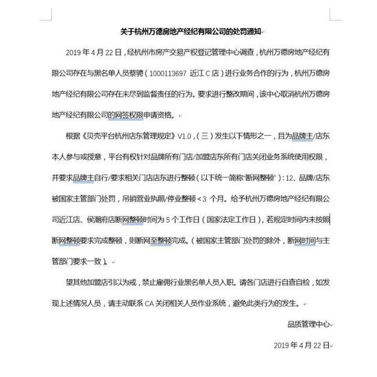 很快解释来了。一张“关于杭州万德房地产经纪有限公司的处罚通知”流出,其中说明两点:一是经杭州市房产交易产权登记管理中心调查,杭州万德房地产经纪有限公司存在与黑名单人员蔡骋进行业务合作的行为,未尽到监督责任,被要求整改,且整改期间取消该公司网签权限申请资格;二是贝壳平台根据内部管理规定要求万德公司近江店、侯潮府店断网整顿,同时要求其他加盟店、各门店进行自查自检。通知落款为“品质管理中心”。