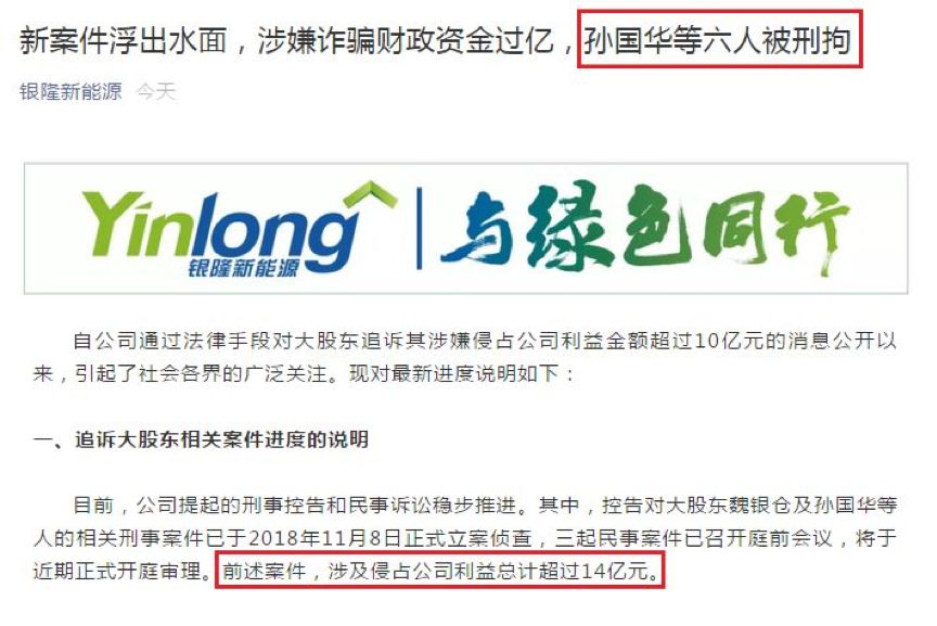去年11月13日,银隆新能源官方网站发布声明称,该公司新一任董事、监事会及公司管理层在履职过程中,发现原董事长魏银仓、原总裁孙国华涉嫌通过不法手段,侵占公司利益金额超过10亿。银隆新能源当时称,公司已向珠海市中级人民法院提起民事诉讼、珠海市公安局经侦支队进行报案,相关机构已正式受理。