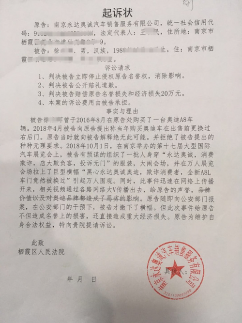 4月24日下午5时许,车主徐先生告诉财经网,自己刚刚结束了南京永达奥诚奥迪4S店反诉自己“侵犯名誉权”的庭审,并称店方索赔的20万元已经被法庭驳回。