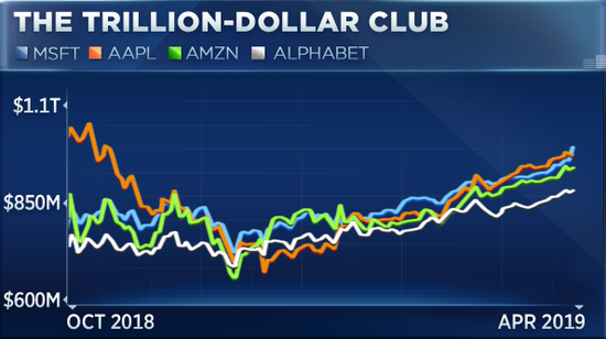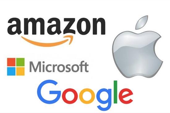 微软、亚马逊、谷歌母公司Alphabet和苹果的股价今年都在飙升,这四家公司合计市值近4万亿美元。这超过了标准普尔指数成分股500家公司一半的总价值。