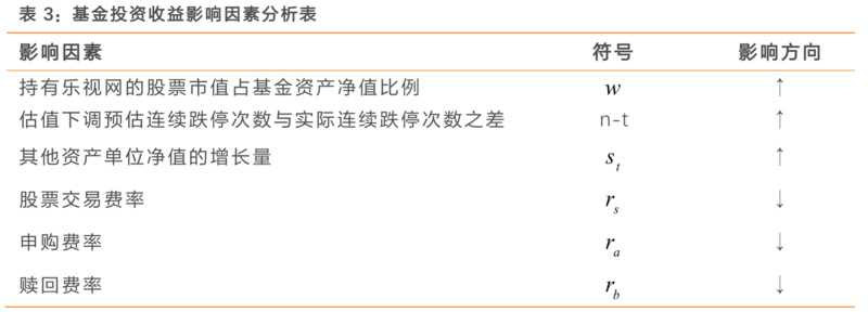 天风证券分析,从复牌第一日到打开跌停板期间的投资收益率Rt,与w(乐视网的股票市值占基金资产净值比例)、n-t(估值下调预估连续跌停次数与实际连续跌停次数之差)、St(其他资产单位净值的增长量)有关。不过,由于实际操作中还需要考虑股票交易和基金交易层面的细节问题,比如基金交易的交易费用和滑点、普通投资者申购和赎回基金的费用等,这些亦会影响最终的收益。