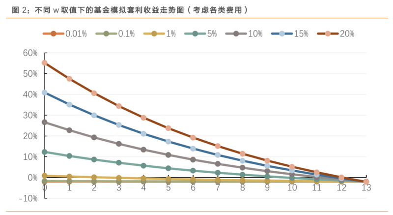 天风证券对此进行了金融工程仿真模拟,在不考虑各类费用的理想情况下,横轴为跌停板出现次数,纵轴为基金持有乐视网的股票市值占基金资产净值比例(w),则套利收益表现为: