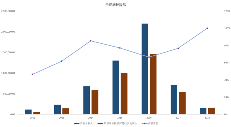 光大证券分析,从资产负债表的角度看,2011年末,乐视网应收账款和其他应收款两个科目在总资产中的占比仅为10.3%,而2016年末时增长至29.1%,绝对规模扩大了50.6倍。 这可能是由于其采用了更为激进的销售策略,例如加大了对下游客户的赊销份额或者是延长了销售账期。不断增长的应收账款美化了发行人的盈利能力,但其背后是现金回笼速度的减缓和应收账款周转率的下降,从而给资金链带来压力。