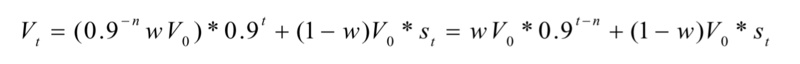 同时,假设该基金已经对乐视网进行下调估值,比例为p=0.9的n次方,其中 n(目前基金普遍预估的跌停板为13次)为估值下调预估的连续跌停次数。所以,在t0日的基金复权单位净值v0可以进一步分解为: