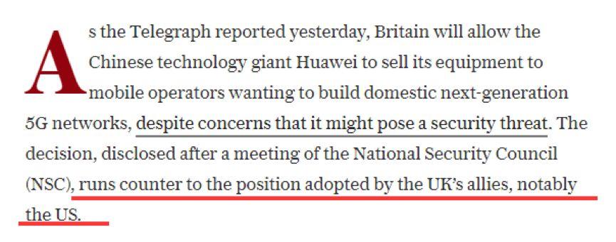 而且鉴于一些英国媒体此前对于英国国家网络安全中心发布的华为评估报告所进行的种种歪曲和“断章取义”,耿直哥也不得不怀疑《电讯报》这次对于特蕾莎?梅所做出的决定的披露,是不是也有断章取义和裁剪事实的部分。