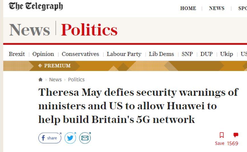 事情起源于2天前的4月24日。当天,英国的《电讯报》突然曝光了一份来自英国政府的机密信息,称英国首相特蕾莎?梅已经决定将允许中国的华为公司参与英国5G网络非核心部分的建设工作。
