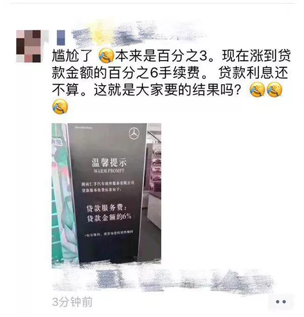 湖南一家奔驰4S店宣布“金融服务费从3%涨到6%”