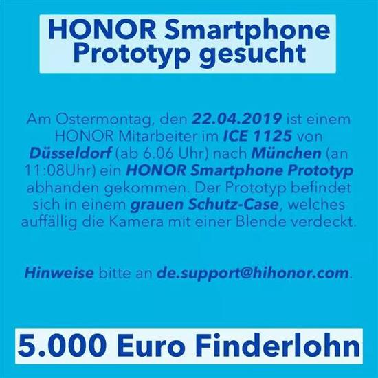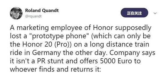 事件发生后,荣耀德国官方推特发布悬赏通知,捡到这款原型机的人给予5000欧元(约合人民币37700元)的奖励。荣耀官方表示,原型机戴有灰色保护壳。 知名爆料人士Roland Quandt猜测遗失的原型机有可能是旗舰机荣耀20或者是荣耀20 Pro。
