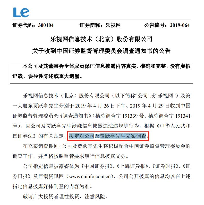 乐视网今日晚间公告,公司及第一大股东贾跃亭分别于2019年4月26日下午、2019年4月29日收到中国证监会《调查通知书》,因公司及贾跃亭涉嫌信息披露违法违规等行为,根据《中华人民共和国证券法》的有关规定,决定对公司及贾跃亭立案调查。