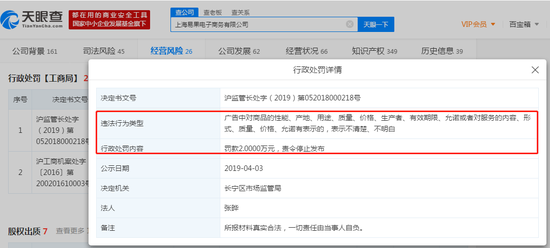 新浪科技讯 4月26日上午消息,天眼查数据显示,近日,易果生鲜主体公司——上海易果电子商务有限公司在广告中对商品的性能、产地、用途、质量、价格等或对服务的内容、形式、质量、价格、允诺有表示的,表示不清楚、不明白,被长宁区市场监管局罚款20000元,并责令停止发布。