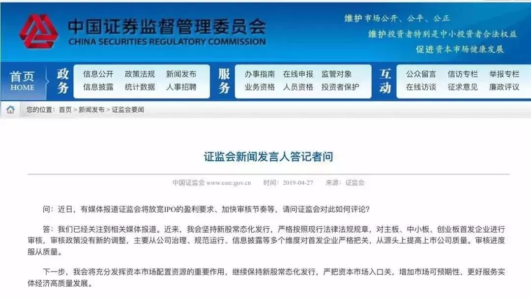 刚刚,证监会新闻发言人否认了“证监会将放宽IPO的盈利要求、加快审核节奏等”谣言。