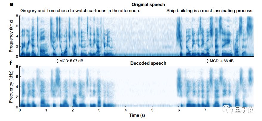 对比志愿者说话的频谱图和大脑信号合成的频谱图,可以看到它们已经非常接近了。