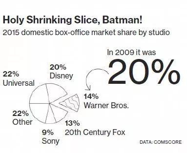 我们先看商业化能力,IP变现真的那么容易吗?一个反面的例子就是超级IP蝙蝠侠和超人,在华纳兄弟手里完全没有做好IP的变现。下图是2015年北美票房的市场份额。我们看到Universal Studio和迪斯尼占到了42%的市场份额。迪斯尼过去几年的崛起就是来自于其对漫威IP的不断变现,推出了一系列的超级英雄系列电影,包括复仇者联盟,钢铁侠等。而且这些电影都拥有超级高的毛利率:44%。相反,华纳兄弟在伟大的诺兰系蝙蝠侠三部曲之后,并没有再推出过超级英雄系列电影。而之前的印钞机魔戒系列也已经变现完了。这也导致华纳兄弟的市场份额从2009年的20%下滑到了2015年的14%。