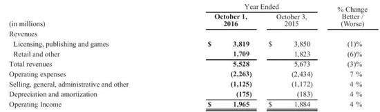 衍生品业务:最后一块,是迪士尼的衍生品业务,2016年收入55亿美元,唯一出现负增长的业务。这一块主要收入来自于授权迪士尼的IP,贡献了38亿美元收入,另一个快就是实体零售,贡献了17亿美元。也就是,我们很多时候看到的迪士尼玩具,也不是迪士尼生产,而是他们授权的。迪士尼有许多经典卡通人物,大家去迪士尼商店,迪士尼乐园都会买几个回去。还有就是一些迪士尼授权的手游,但销售一直也比较一般。包括冰雪奇缘,星球大战等等。