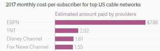 电视媒体:2016年电视媒体贡献了236亿美元收入,是迪士尼收入来源最大的业务,2016年收入增速放缓到了2%。这一块其实就是有线电视台,其中以当年收购的体育电视台ESPN的收入占比最大。ESPN是我自己最喜欢的一个电视频道,每天有大量的体育比赛和内容,还有Sports Center体育新闻集锦。过去几年美国电视最大的趋势就是流媒体崛起。Netflix刚刚公布了超预期,股价接近800亿美元。在这个大趋势中,ESPN相比其他电视台受到冲击要小一些,毕竟体育比赛还是要看直播,不适合流媒体。下图是美国有线电商大概的频道付费情况。我们看到ESPN价值远超TNT这种。