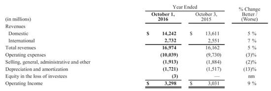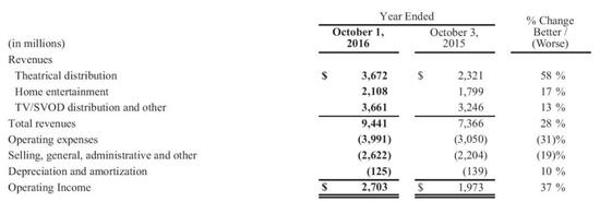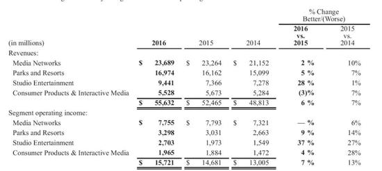 娱乐事业部:2016年来自迪士尼娱乐事业部的收入为94亿美元,大幅增长了28%,是迪士尼所有版块中增速最快的。这一块就是迪士尼的电影事业部。2016年的财年,迪士尼有好几部卖座大片,包括星球大战,美国队长内战,疯狂动物园,寻找多利等。在收购了漫威之后,对于迪士尼电影IP起到了很好的商业化补充。从漫威各种超级英雄,再到超级英雄们的大混战,每一次的彩蛋又会预告一个新的英雄。一环扣一环,可以说迪士尼是商业化能力的老司机。另一块是迪士尼的内容分发,包括一些流媒体电影和电视剧的分发,这一块虽然很多国内朋友感知不到,在美国买皮克斯的流媒体内容是很常见的。而收入在2016年也有36亿,几乎和电影票房收入一样了。