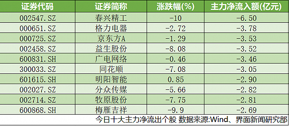 沪深两市共计76只个股主力净流出额超1亿元。春兴精工(002547.SZ)、格力电器(000651.SZ)、京东方A(002547.SZ)主力净流出额位居前三,分别为6.50亿元、3.78亿元、3.53亿元。梅雁吉祥(600868.SH)逼近跌停,跌幅为9.9%。