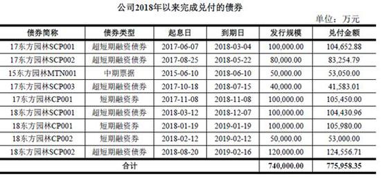 公开资料显示,2018年以来,东方园林累计兑付债券金额为77.60亿。