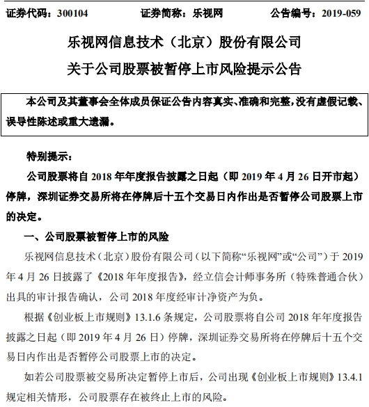 4月26日凌晨,乐视网发布2018年年报,年报显示,乐视网去年归属于母公司净资产为-30.26亿元。根据《创业板股票上市规则》,乐视网已触及“最近一个年度的财务会计报告显示当年年末经审计净资产为负”条件,股票在4月26日起被停止交易,深圳证券交易所将在停牌后15个交易日内作出是否暂停公司股票上市的决定。