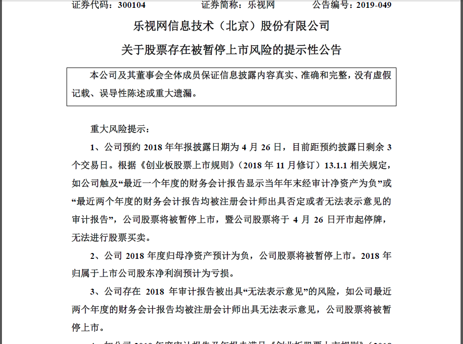 事实上,在4月1日晚间发布的《关于股票存在被暂停上市风险的提示性公告》中,乐视网已提前披露,预计乐融致新评估结果在35亿元以下,2018年度归属于公司所有者权益预计为负,但当时并未引起股民的足够重视。