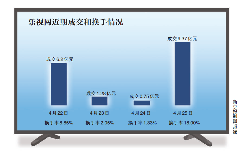 4月25日,乐视网成交额9.37亿元,换手率18.00%。此前三个交易日乐视网连续跌停,分别下跌9.96%、10.18%、9.85%。在这三个跌停中,仍有不少买单出现。4月22日乐视网成交6.2亿元,换手率达到8.85%;4月23日乐视网成交1.28亿元,换手率达到2.05%;4月24日乐视网成交0.75亿,换手率达到1.33%。