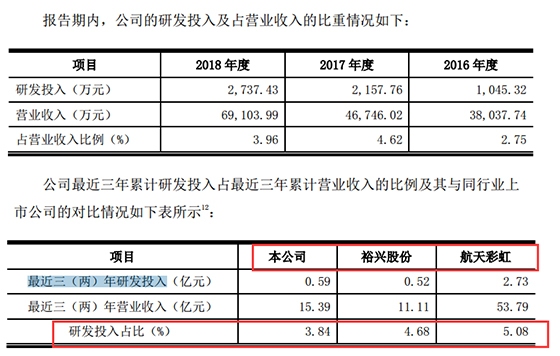 招股说明书显示,2016-2018年,长阳科技研发投入共计0.59亿元,占营业收入的比例为3.84%,而同期可比公司裕兴股份和航天彩虹研发投入占营业收入的比例分别为4.68%和5.08%。对此,长阳科技在回复中国网财经记者的函件中表示:公司为非上市公司,存在创立时间短、资金实力有限的实际情况,有限的资金需要兼顾研发和生产的平衡。未来随着公司上市后融资环境的优化,公司盈利能力的大幅提升,公司将不断增加研发投入,公司的研发费用率将大幅上升,达到并超过行业平均水平。