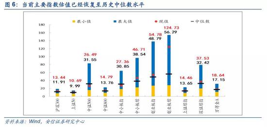 站在当前时点,A股整体估值已修复至历史均值水平。wind全A估值为18.64倍,较历史中位数为17.15倍已经偏高,历史分位水平已经提升至59.59%。上证综指等主要指数也都已经修复至历史均值以上。主要指数只有中小板指数和中证500指数依然低于历史均值。而从行业层面来看,多数行业估值水平也已经恢复至历史均值水平。