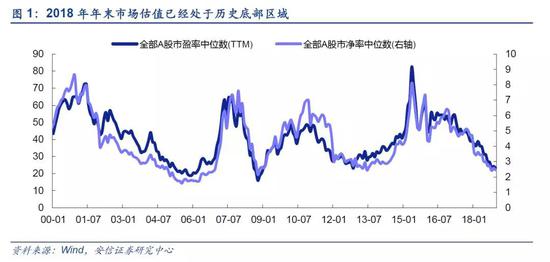 2018年末,A股市场估值水平已经处于市场极端水平,这是估值修复必然性的内因。从全A市盈率(TTM)中位数和市净率中位数来看,2005年6月市盈率21.49倍,市净率1.73倍;2008年10月市盈率15.94倍,市净率2.16倍;2013年6月市盈率27.81倍,市净率2.45倍。2018年年末全部A股市盈率中位数23.33倍,市净率中位数2.46倍,市盈率已经低于2013年底部区间水平。