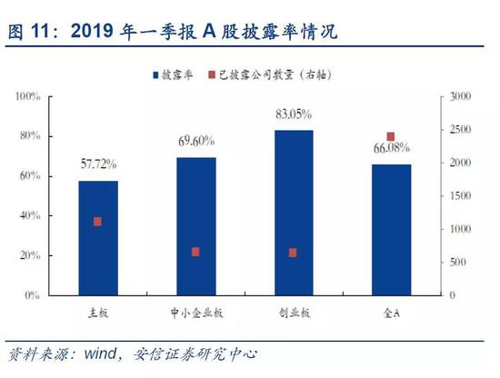 同时,A股共有2385家上市公司公布2019年一季报,披露率为66.08%。其中,三大板块披露率分别为主板(57.72%)、中小板(69.60%)、创业板(83.05%)。从目前来看,2019Q1全A(非金融石油石化)归母净利润同比增速预估为5.00%,环比去年Q4的极端情况自然回升,相较于2018年同期(25.04%)下降,但整体好于此前市场预期。