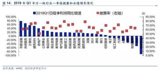 从一级行业已披露数据来看,2019Q1归母净利润增速前五的分别为:非银金融(76.78%)、休闲服务(65.13%)、计算机(55.28%)、建筑材料(51.42%)、房地产(39.16%);增速后五的行业分别为:化工(-22.79%)、传媒(-29.89%)、有色金属(-35.29%)、钢铁(-49.31%)、农林牧渔(-91.01%)。