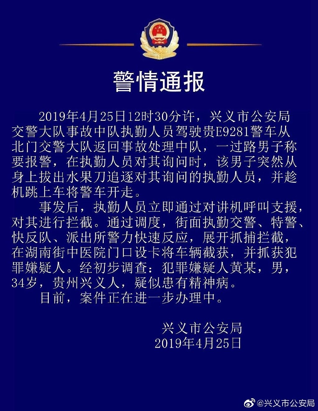2019年4月25日12时30分许,兴义市公安局交警大队事故中队执勤人员驾驶贵E9281警车从北门交警大队返回事故处理中队,一过路男子称要报警,在执勤人员对其询问时,该男子突然从身上拔出水果刀追逐对其询问的执勤人员,并趁机跳上车将警车开走。事发后,执勤人员立即通过对讲机呼叫支援,对其进行拦截。通过调度,街面执勤交警、特警、快反队、派出所警力快速反应,展开抓捕拦截,在湖南街中医院门口设卡将车辆截获,并抓获犯罪嫌疑人。经初步调查:犯罪嫌疑人黄某,男,34岁,贵州兴义人,疑似患有精神病。目前,案件正在进一步办理中。