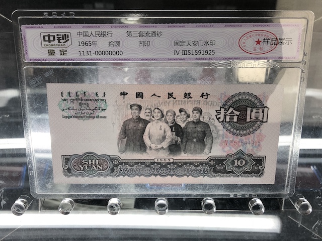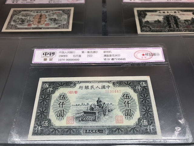 在展会现场,记者有幸一览各个时期发行的人民币。其中,还有面值为5000元的人民币。方寸纸上,承载着我国各个时期不同的经济与文化背景。