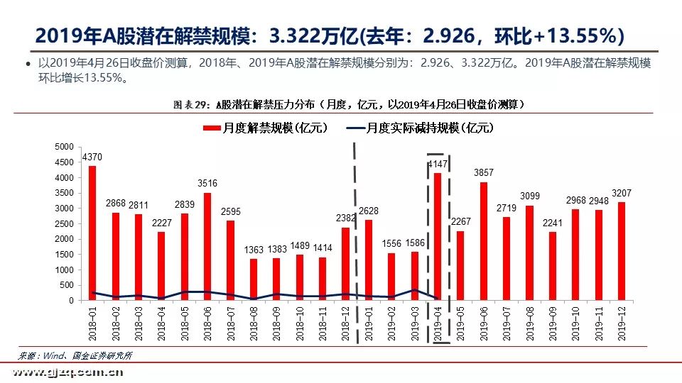 A股市场潜在解禁规模:以2019年4月26日收盘价测算,2018年、2019年A股潜在解禁规模分别为:2.926、3.322万亿。2019年A股潜在解禁规模环比增长13.55%。2019年4月A股潜在解禁规模4146.53亿元,占全年潜在解禁规模的12.48%,属于全年解禁压力较高的月份。