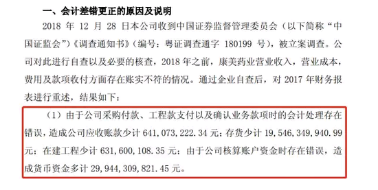 康美药业4月29日公告称,由于公司采购付款、工程款支付以及确认业务款项时的会计处理存在错误,造成公司应收账款少计641,073,222.34元;存货少计19,546,349,940.99元;在建工程少计631,600,108.35元;由于公司核算账户资金时存在错误,造成货币资金多计29,944,309,821.45元。