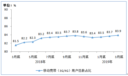 2018年3月底-2019年3月底移动宽带用户总数占比情况