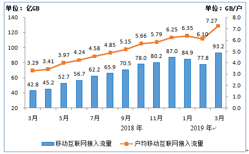 当月户均移动互联网接入流量(DOU)超7GB。一季度,移动互联网累计流量达256亿GB,同比增长129.1%;其中通过手机上网的流量达到255亿GB,同比增长133.2%,占移动互联网总流量的99.5%。3月当月户均移动互联网接入流量(DOU)达到7.27GB,同比增长121.1%。