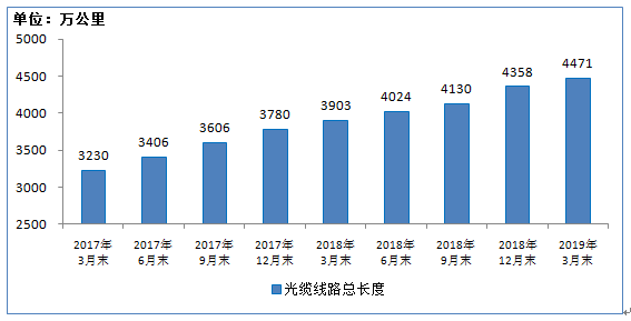2017年3月末-2019年3月末光缆线路总长度发展情况