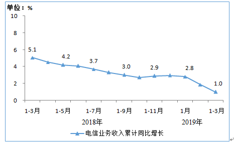 从总体上来看,电信业务收入增速继续放缓。一季度,电信业务收入累计完成3323亿元,同比增长1.0%,增速同比回落4.1个百分点,较1-2月回落0.9个百分点。