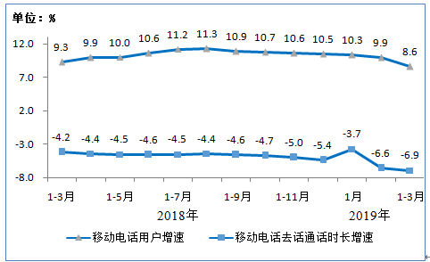移动电话通话量持续下降。一季度,全国移动电话去话通话时长完成5850亿分钟,同比下降6.9%,降幅较上年末扩大1.5个百分点;全国固定电话主叫通话时长完成301亿分钟,同比下降18.8%。
