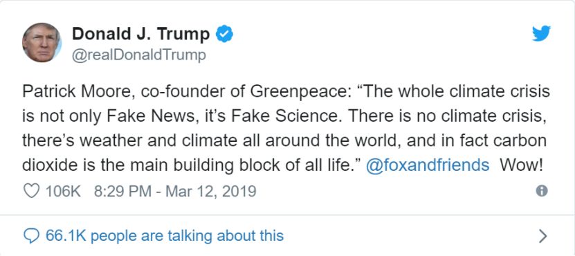 就在上个月,特朗普再次在推特上质疑全球气候危机是“假消息”更是“伪科学”。