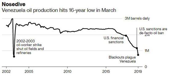 数据显示,委内瑞拉3月原油产量跌破100万桶/日,创16年新低。随着电力中断导致油田、管道和港口关闭,石油基础设施瘫痪,国有石油公司PDVSA不得不向另一个欧佩克成员国尼日利亚购买了一船近100万桶原油,这是委内瑞拉自2014年以来首次进口石油。
